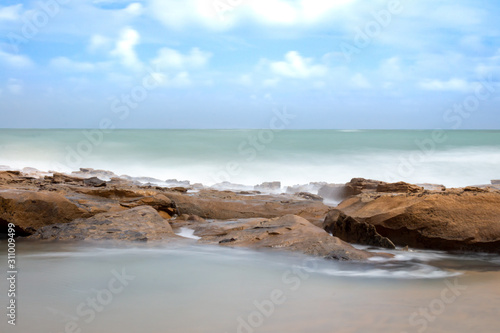 Fototapeta premium Long exposure photography. Silk effect in water. Marine rocks bathed in foam...