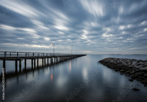 Obraz premium Long Exposure Pier with Moody Sky Over Calm Water Landscape