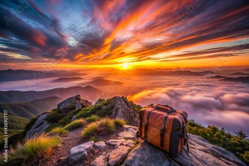 © Supittra, Fototapeta premium Long Exposure: Travel Bag & Majestic Mountain Peak Sunrise
