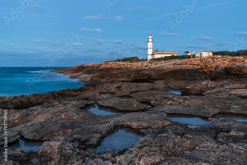 © makasana photo, Fototapeta premium long exposure view of the Cap de ses Salines Lighthouse on Mallorca just before sunrise
