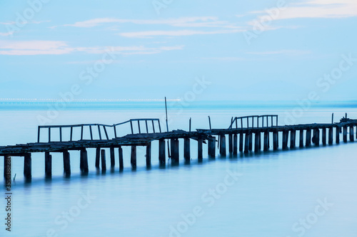 © keongdagreat, Obraz premium Long exposure view of wooden bridge in blue background