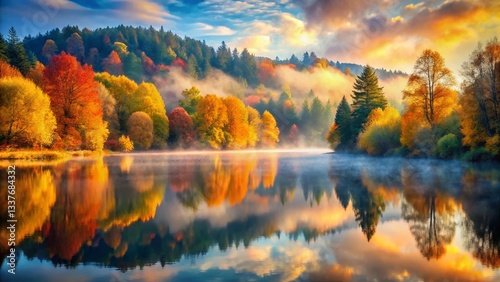 Naklejka premium Long Exposure Watercolor Autumn Lake Landscape - Vibrant Fall Colors & Misty Reflections