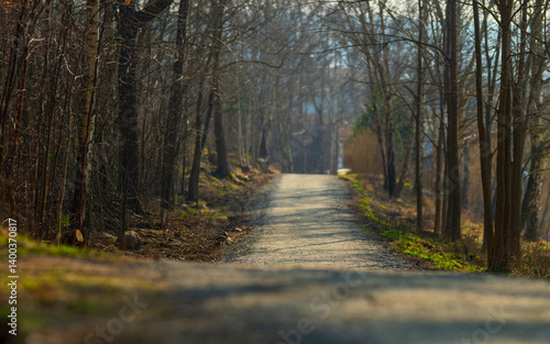 Fototapeta premium Long Forest Walkway Surrounded By Bare Trees.