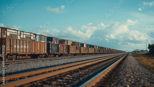Fototapeta premium Long freight train on railway tracks under dramatic cloud sky conveying...