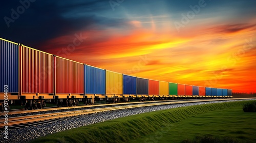 Fototapeta premium Long freight train with colorful containers curving on track at sunset,...