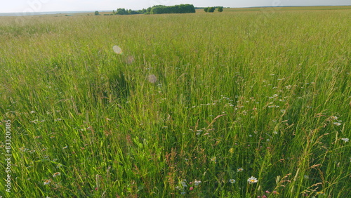 Obraz premium Long grass swaying in the wind on a warm summer day. Wide shot.