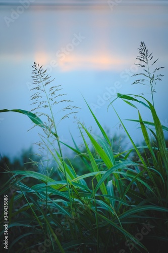 Fototapeta premium Long, green grass blades against summer evening sky. Peaceful, calm scene.
