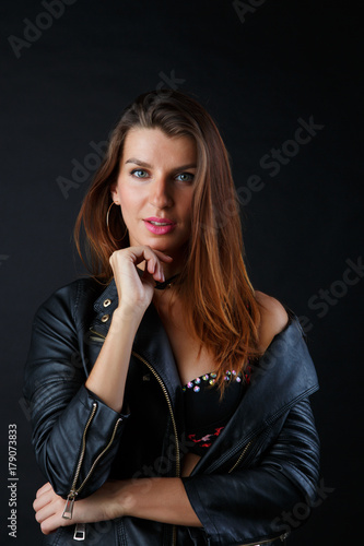 Fototapeta premium Long-haired brunette in lingerie, leather jacket