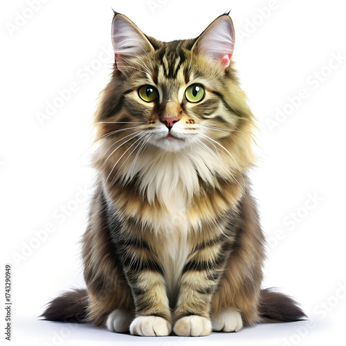 Obraz premium Long Haired Tabby Cat Sitting Front View White Background