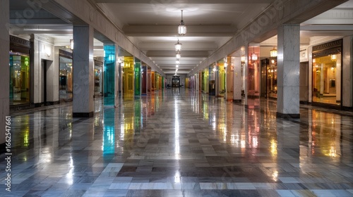 © choirul, Fototapeta premium Long hallway with colorful store reflections