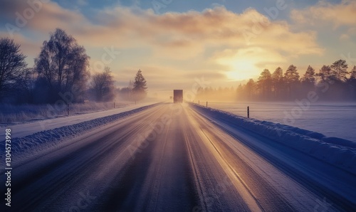 Fototapeta premium Long-haul truck driving through a misty highway at sunrise, casting dramatic...