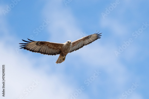 Fototapeta premium Long-legged Buzzard Buteo rufinus flying in the sky