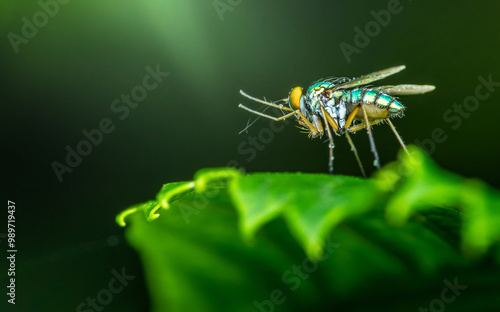 © Pawich Sattalerd, Fototapeta premium Long legged fly standing on a green leaf.