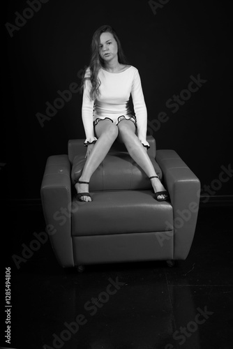 Fototapeta premium Long legged young woman in white dress sitting on a chair black and white low key portrait
