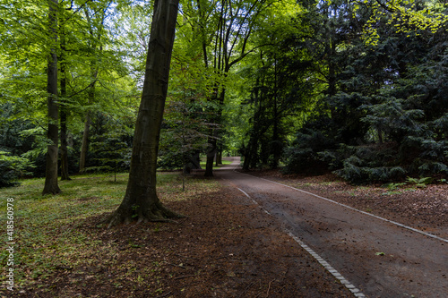 © Pawel-Wierzchowski, Naklejka premium Long path in park full of green trees and bushes