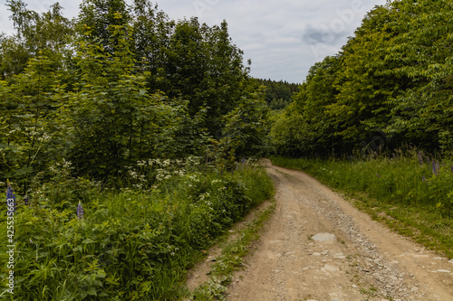 Fototapeta premium Long path with bushes and fields around in Kaczawskie mountains