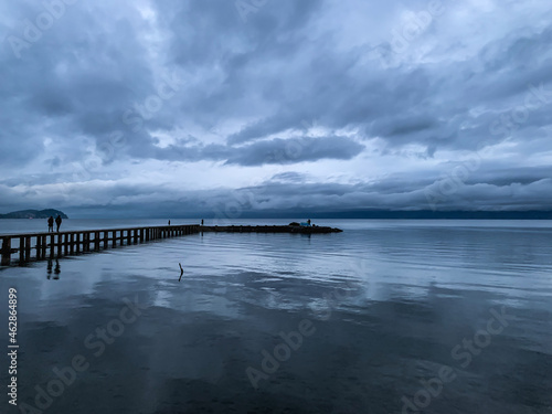Fototapeta premium Long pier at the lake, twilight, dark blue and gray sky and lake, mountains...