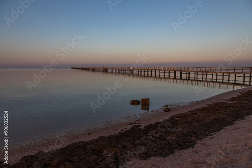 Fototapeta premium Long pier near the sea. Beautiful summer evening. Smooth water with reflection.