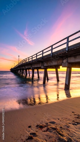© Wahyu, Fototapeta premium Long pier stretches towards the horizon at sunset with beautiful colors