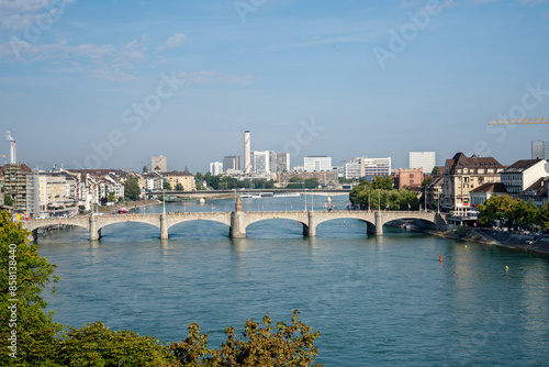Obraz premium Long range shot of the Middle Bridge, a historic bridge in the Swiss city of Basel.