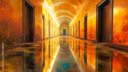 © MD, Fototapeta premium Long Reflective Corridor with Distant Door