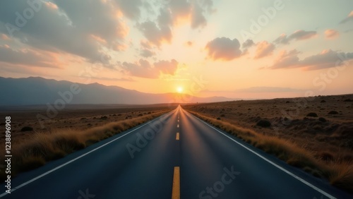 Naklejka premium Long road at sunset with clear blue sky and golden hour on the horizon in the...