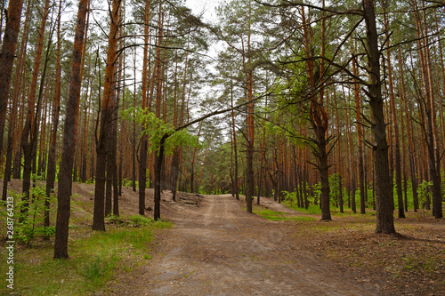 Fototapeta premium Long road in a pine forest. Summer nature.