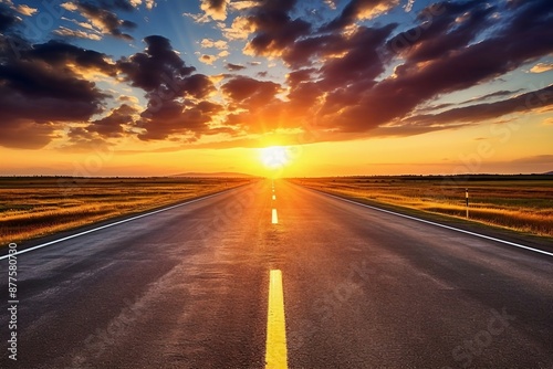 Naklejka premium Long Road in Desert at Dusk Featuring Dramatic Sky and Colorful Sunset...