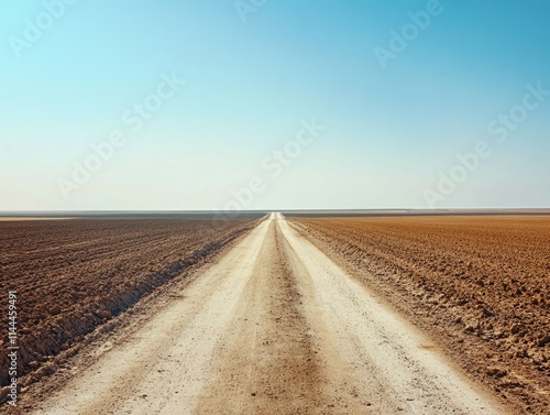 Fototapeta premium Long road stretches across a dry, barren landscape. The sky is clear and blue, and the sun is shining brightly. The road is unpaved and dusty, and there are no signs of life in the area