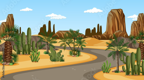 Fototapeta premium Long road through desert forest landscape at day time scene
