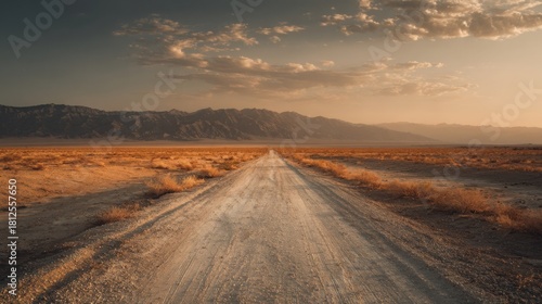 Fototapeta premium long road through desert with distant mountains, golden hour lighting,...