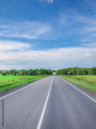 © Sergei, Fototapeta premium Long road with a clear blue sky above it