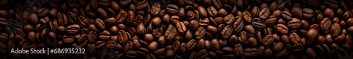 © Duka Mer, Naklejka premium Long rows of dark brown coffee beans arranged next to each other, with decorative patterns.