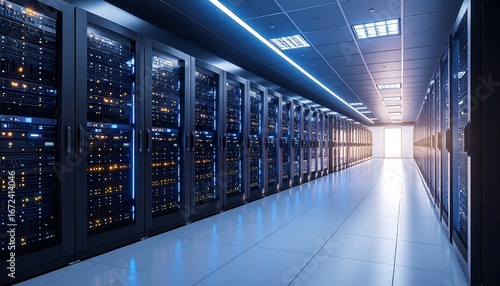 © dangu, Fototapeta premium Long server room corridor with rows of lit racks