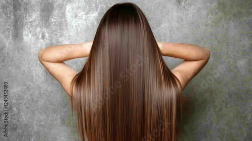 Fototapeta premium Long, shiny hair flowing down woman back against textured background