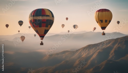 Naklejka premium long shot of multi-colored hot air balloons floating above the mountains
