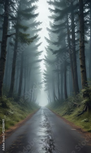 Fototapeta premium Long solitary road traversing a strange and eerie forest landscape, vines ,...