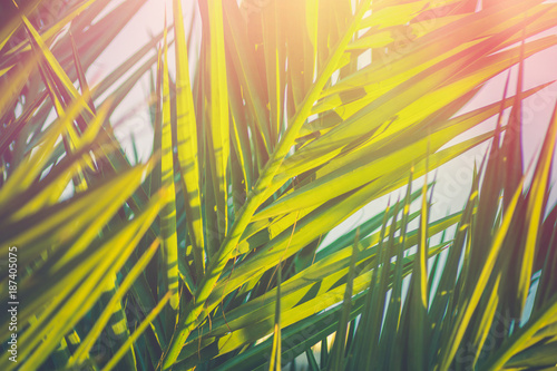 © olindana, Fototapeta premium Long Spiky Feathery Palm Tree Leaves in Golden Pink Sunlight Flare. Hipster Toned Poster Banner Template. Tropical Foliage Background Vacation Tourism