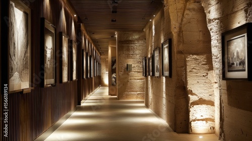 © Ginta, Fototapeta premium Long Stone Corridor Gallery Interior With Warm Lighting
