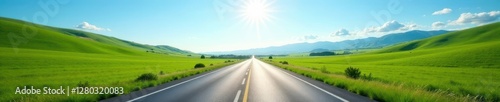 © Sirapob, Naklejka premium Long straight highway disappearing into sunny blue sky above rolling green hills, countryside, scenic