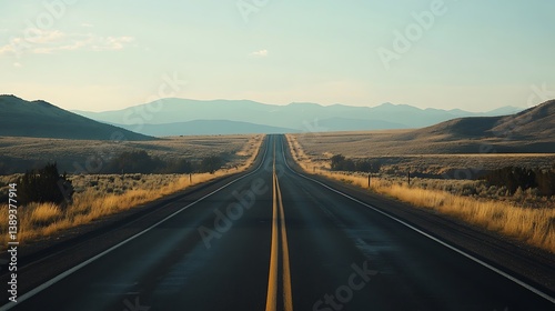 Fototapeta premium Long, straight highway vanishing into distant mountains under a clear sky.