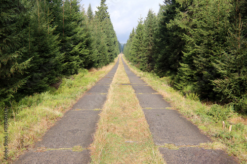 Obraz premium Long straight path through a spruce forest