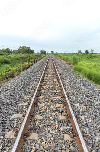 © thanet69, Fototapeta premium Long straight railroad on concrete sleepers in a rural