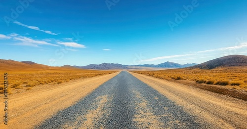© Rgrd, Naklejka premium Long straight road stretching through an arid desert landscape with sparse dry grass under a bright blue sky and distant mountains