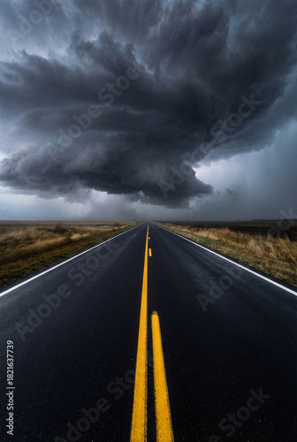 © Soom Space, Fototapeta premium Long straight road under a dramatic stormy sky with dark, heavy clouds