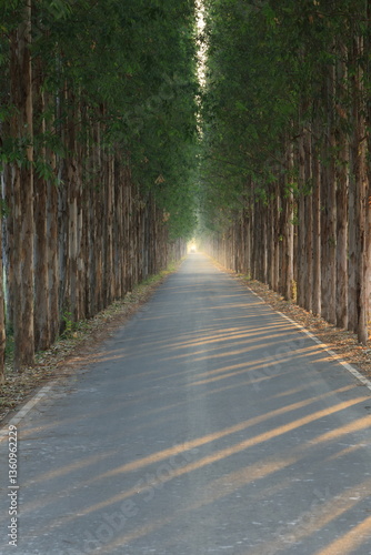 © Jimmynature, Naklejka premium Long straight road with enormous eucalyptus trees in the Kasetsart Unitversity Kamphaeng Saen campus ,Thailand