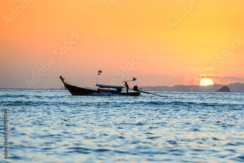 © aphotostory, Naklejka premium Long tail boat at dusk. Thailand.