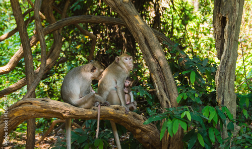 Fototapeta premium Long-tailed macaque family on tree