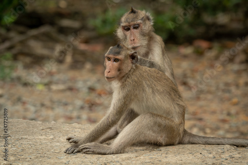 Obraz premium Long-tailed macaque grooming mate on concrete path