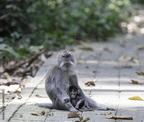 Obraz premium Long-tailed macaque monkeys with baby in Ubud monkey forest, Bali, Indonesia